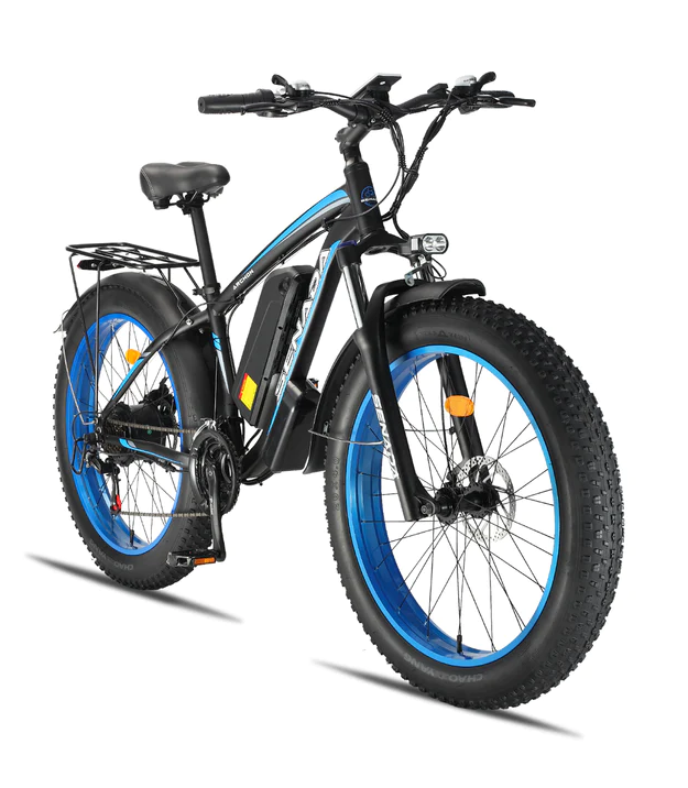 Senada delivers quality components at a competitive price. 26"x4" comfort fat tires ensure increased traction, even on the most challenging terrains, for a smooth ride. 160mm mechanical disc brakes (front and rear) provide sufficient stopping power to bring the e-bike to a swift and steady stop. A Prowheel aluminum crankset with a crankset guard shields the chain ring and allows it to traverse rough terrain. Shimano's 21-speed freewheel enables you to adjust your speed to suit your needs, with the pedal-assist system adding extra power. The full aluminum suspension control locking fork provides 100mm of travel, and the 450 lm headlight ensures safe nighttime rides with a functional horn.